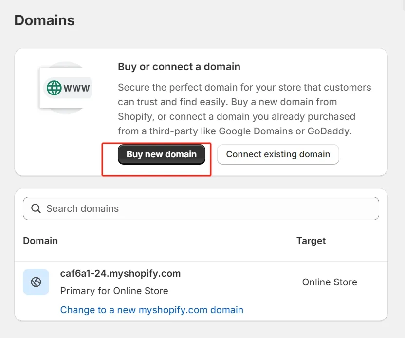 接着,为自己的独立站添加域名,这将成为客户访问商店的路径。域名可以从Shopify直接购买,也可以使用现有域名或当前的“myshopify域名”,但建议选择简短、易记的“.com”域名,以提升专业性和用户记忆度。
