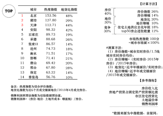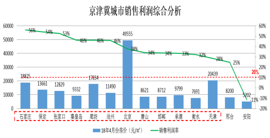 从销售利润率看,大于25%的城市有12个,为石家庄、保定、张家口、秦皇岛、廊坊、沧州、北京、唐山、邯郸那、承德、衡水、天津;20%-25%的城市有1个,为邢台。销售利润率=(房价-地价-土地外成本-增值税)/房价,土地外成本按3600元估算。增值税=(房价-地价)*10%/(1+10%)-3600*8%。需要注意的是:销售价格为2018年4月份价格,楼面价为近6个月成交楼面价,北京、天津土地外成本按5500元/㎡测算。