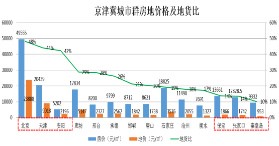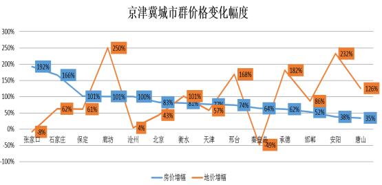 京津冀城市群房价平均涨幅为88%,地价平均涨幅为94%。房价涨幅高于城市群整体平均增幅的城市共有5个,分别为张家口、石家庄、廊坊、保定、沧州;地价涨幅高于城市群整体平均增幅的城市共有6个,分别为廊坊、安阳、承德、邢台、唐山、衡水。
