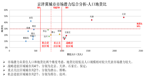 市场潜力从常住人口和地货比两个维度考虑,地货比较低且人口规模相对较大代表市场潜力较大。战略进驻区域城市共4个,分别为北京、天津、石家庄、保定;重点关注区域城市共2个,分别为唐山、邯郸;机会进驻区域城市共2个,分别为邢台、沧州。