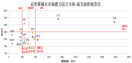 市场潜力从成交面积和地货比两个维度考虑,地货比较低且成交面积较大代表市场潜力较大。战略进驻区域城市共3个,分别为天津、北京、石家庄;重点关注区域城市共2个,分别为唐山、廊坊;机会进驻区域城市共4个,分别为邯郸、衡水、秦皇岛、保定。