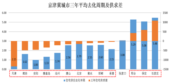 京津冀城市群住宅供应去化年限为2.74年,去化周期小于3年的有10个。整体来看,天津、廊坊、安阳、秦皇岛、沧州、唐山、北京、衡水、邯郸、承德等城市市场供不应求;邢台、保定、石家庄等城市市场供过于求。