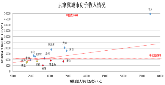 房价收入情况,在均值线下,居民收入较大且距离轴线向下偏离越大代表房价上涨潜力越强。重点关注城市有安阳、唐山、秦皇岛;一般关注城市衡水、邢台、邯郸。
