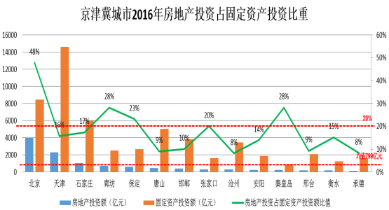 2016年京津冀城市群房地产投资额为11189亿元,占全国房地产投资额135284亿元的8.27%;房地产投资额在均值799亿元以上的城市有3个,分别是北京、天津及石家庄。房地产投资占固定资产投资比重超过25%的有3个,分别为北京、廊坊及秦皇岛,此区域房地产投资相对过热,建议谨慎拿地;介于15%至25%的有5个,分别为天津、石家庄、保定、张家口及衡水,此区域为房地产合理投资区,建议重点关注;在15%以下的城市有6个,此区域房地产投资相对较少,存在潜在投资机会。
