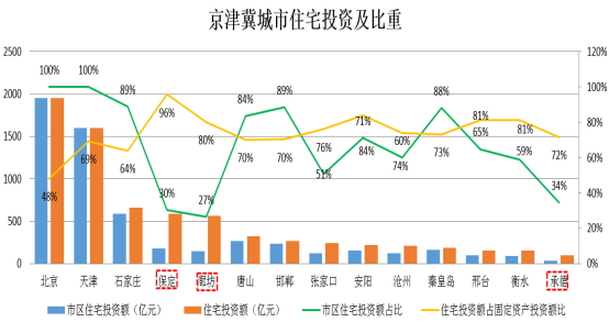 2016年京津冀城市群住宅投资额为7230亿元,住宅投资额在均值387亿元以上的城市有5个,分别为北京、天津、石家庄、保定、廊坊。整个城市群住宅投资额占房地产投资额比重为65%,市区住宅投资占全市住宅投资的80%。市区住宅投资占比低于50%的城市有:廊坊、保定、承德,以上城市所辖县级城市房地产投资较为活跃,应重点关注。