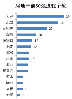 天津、北京TOP50房企进驻较多,市场竞争十分激烈;石家庄、廊坊、张家口、保定、邯郸、唐山已经有10家以上TOP50房企进驻;邢台、秦皇岛、衡水、沧州。承德均有5家以上TOP50房企进驻。