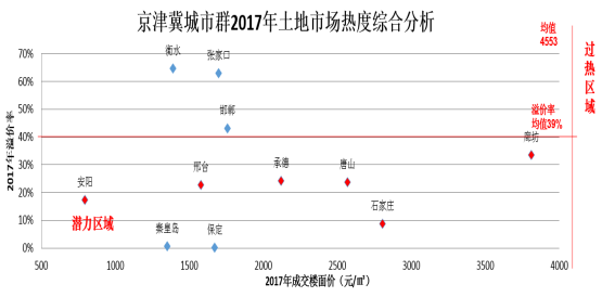 土地市场热度从成交楼面地价和溢价率两个维度考虑,成交楼面地价和溢价率均较低代表土地市场潜在热度较大。重点关注城市有廊坊、唐山、承德、邢台、安阳、石家庄。(溢价率在5%以下市场公开程度较低,需谨慎关注。)