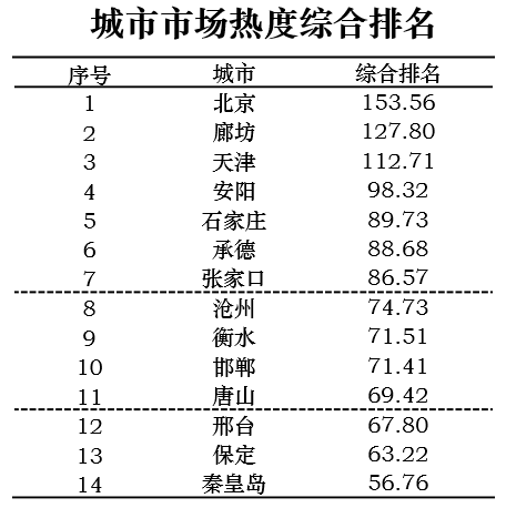 京津冀城市群城市市场热度综合排名TOP3的城市为:北京、廊坊、天津。
