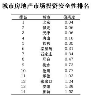 京津冀城市群城市房地产投资安全性综合排名TOP3的城市为:北京、保定、天津。偏离度大于1的城市投资风险较高,应谨慎投资,主要城市有廊坊、安阳、张家口及承德。