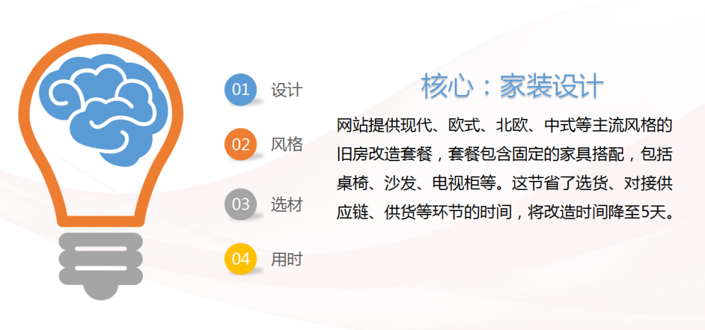 ①致力于在最短的时间、用最少的费用、最大限度地改善客户的家居环境;